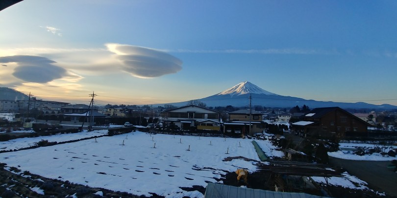 13 février 2018 4160 × 2080 Lever du soleil sur le Fuji. 3776 mètres de hauteur. Et ses 2 soucoupes volantes!!!!