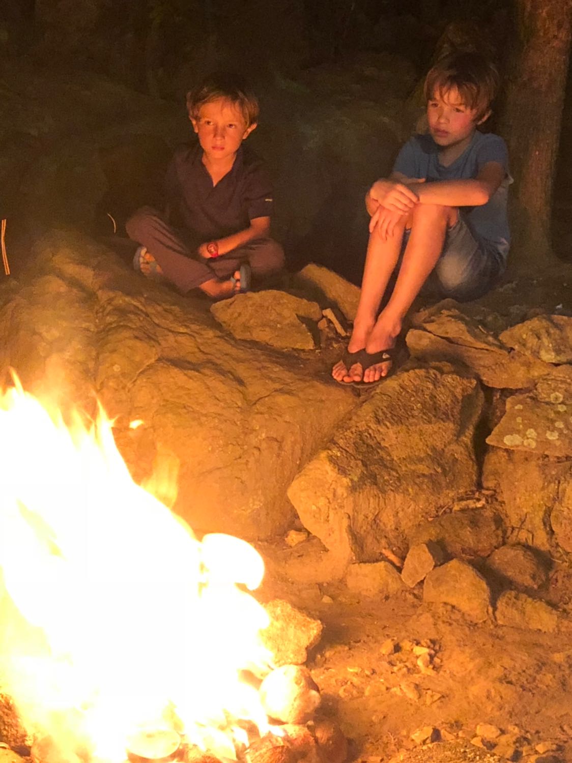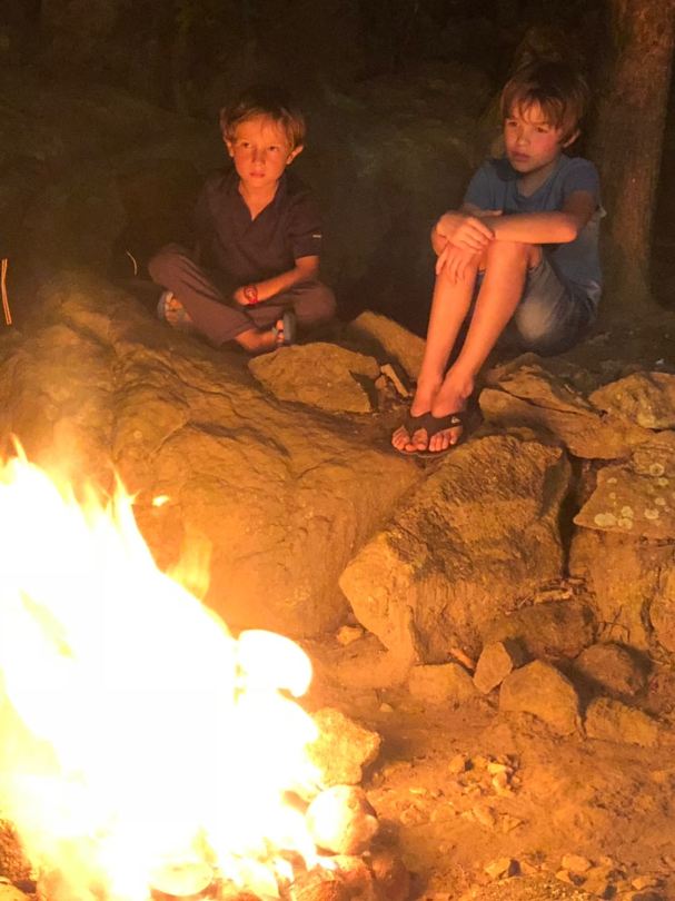 Les garçons sont captivés . Braises faîtes avec noix de coco.