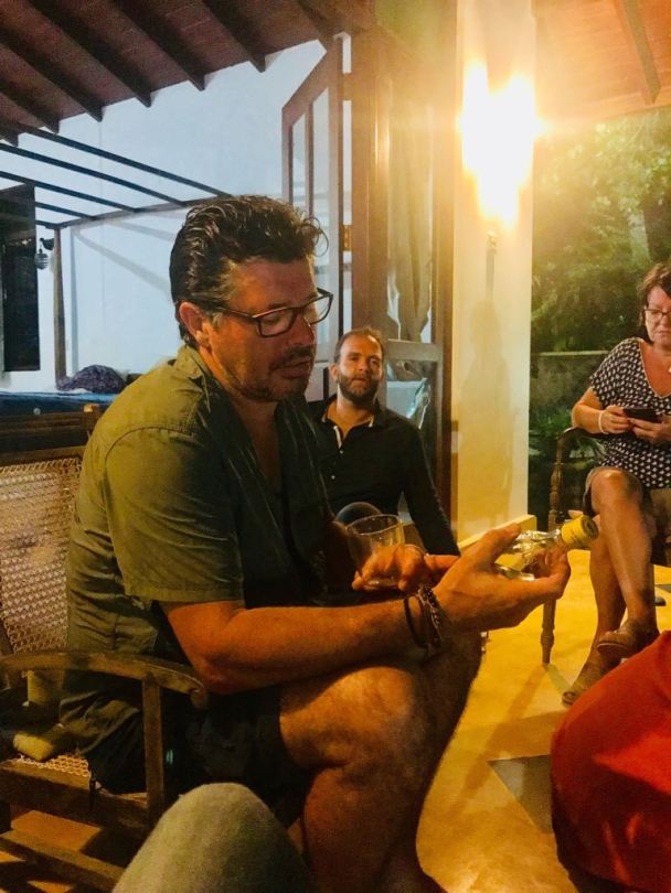 Devant une bouteille d’ARRACK, alcool à base de noix de coco.