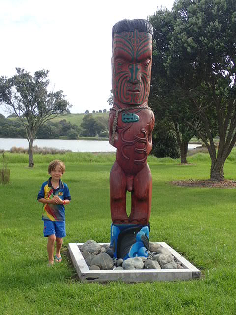 Entrée du Tawharanui Regional Park. Et Simon impressionné par le gros ……