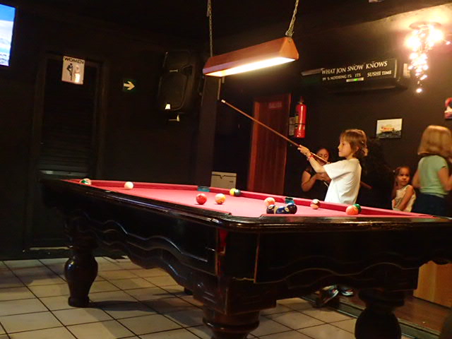 Simon au billard avec une jeune fille et nous à la recherche de Wi-Fi.