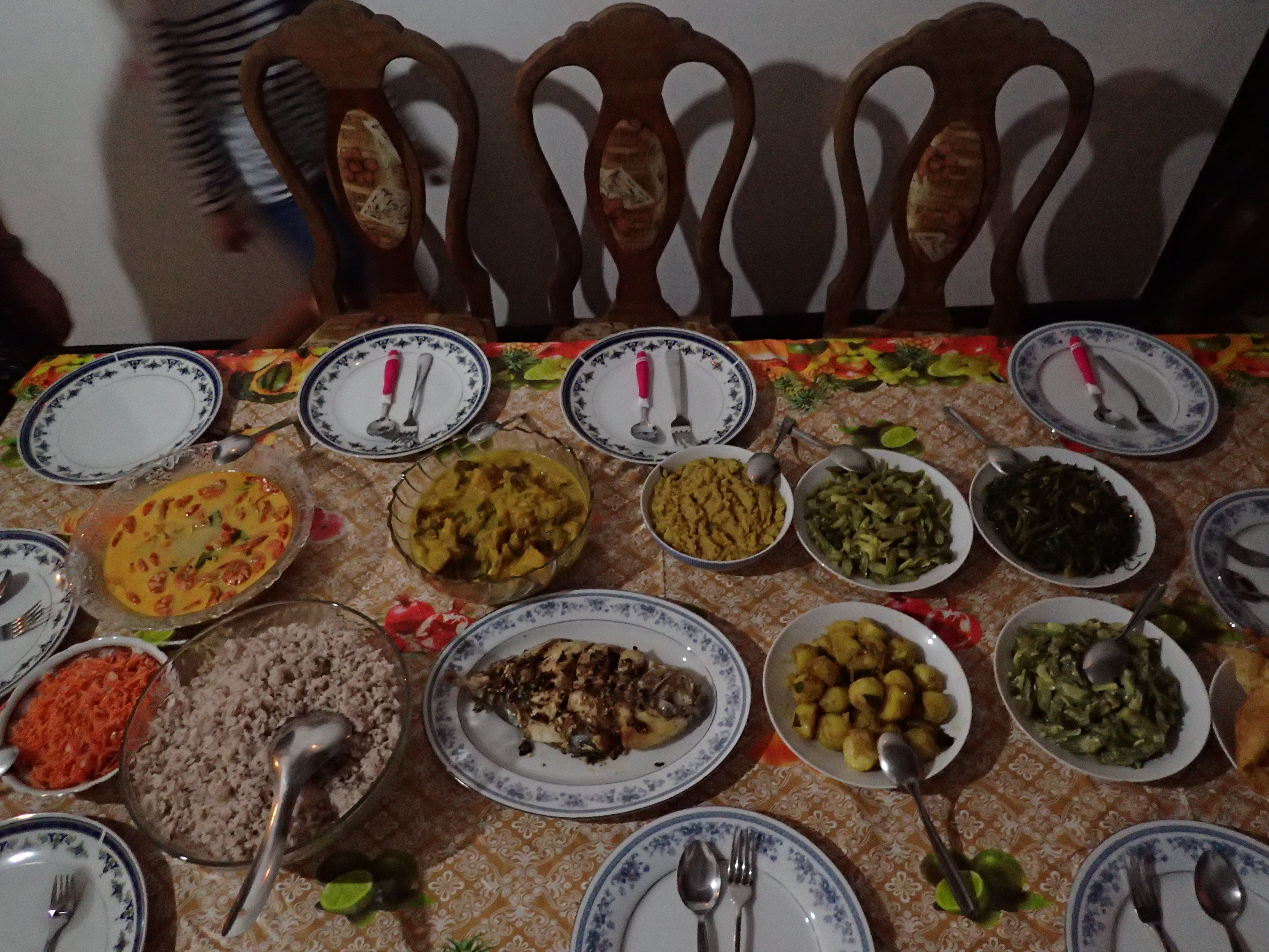 Repas de noël dans la famille de notre hôte. Crevettes et poisson.